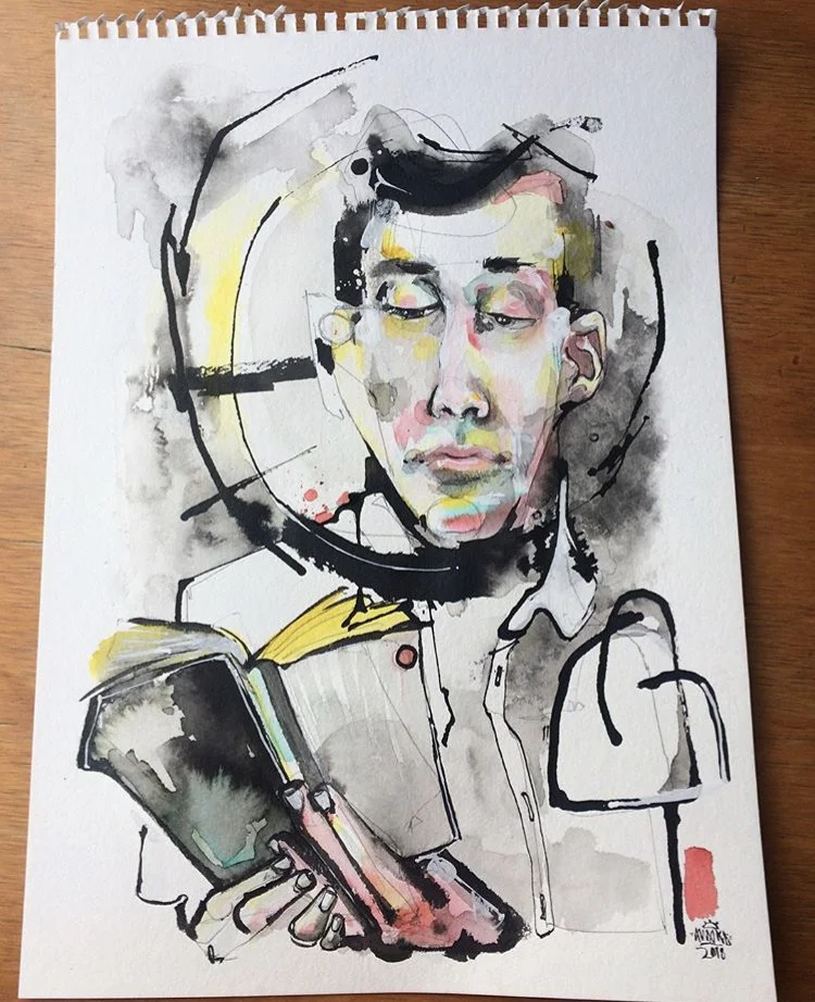 Though I have been art making since I was in high school, I started painting people from live observation back in 2018. What started as a simple coffeehouse paint hangout with a friend lead me to paint over 150 people in that first year and a half. I would paint anyone who would sit with me, mostly meeting up with people I had met off of Instagram or Reddit. At the time I was working mostly on paper and depicting people with layers of watercolor, acrylic paint markers, and an India ink brush pen. I had a very portable kit at the time and would carry it everywhere in my backpack.