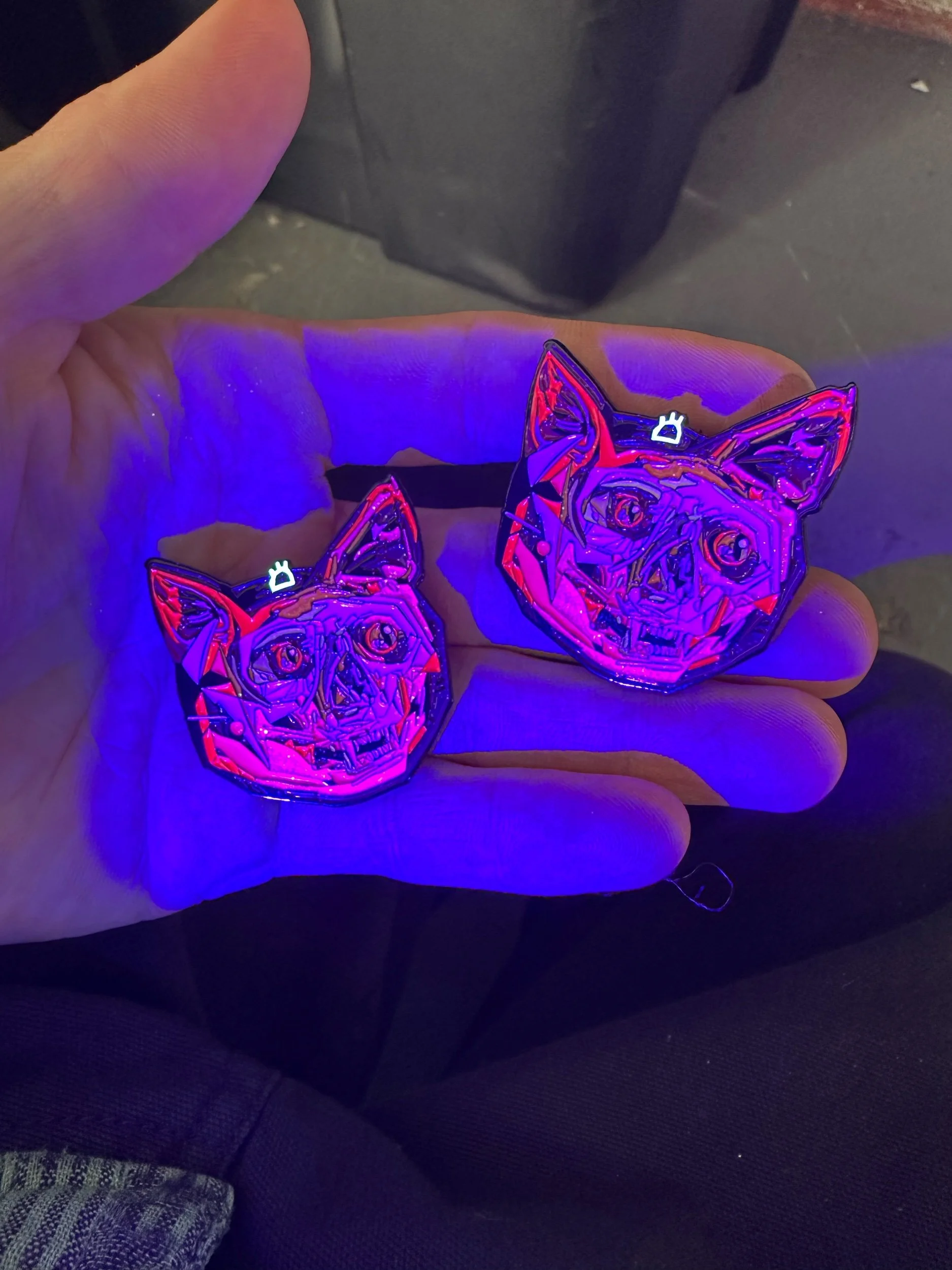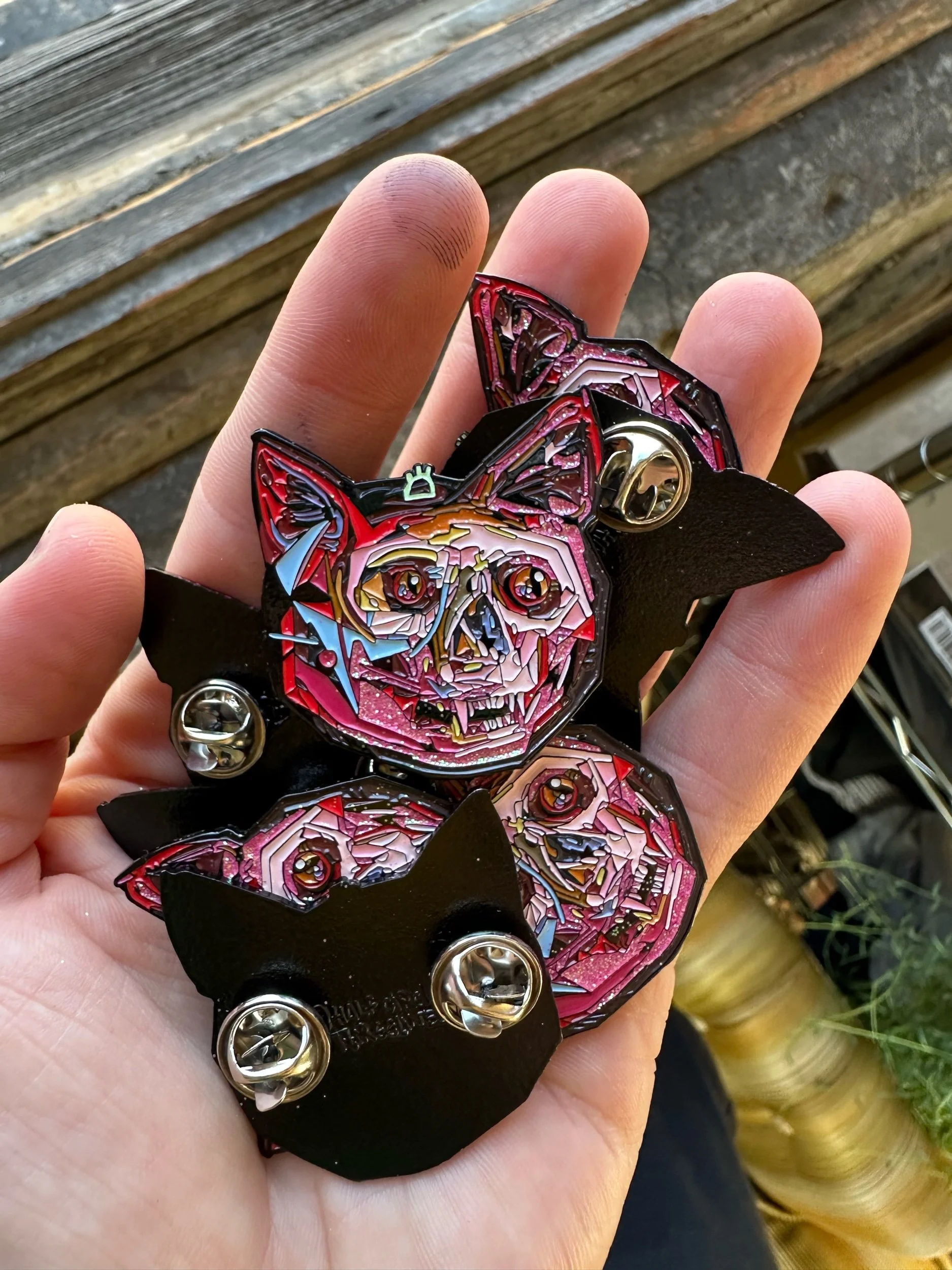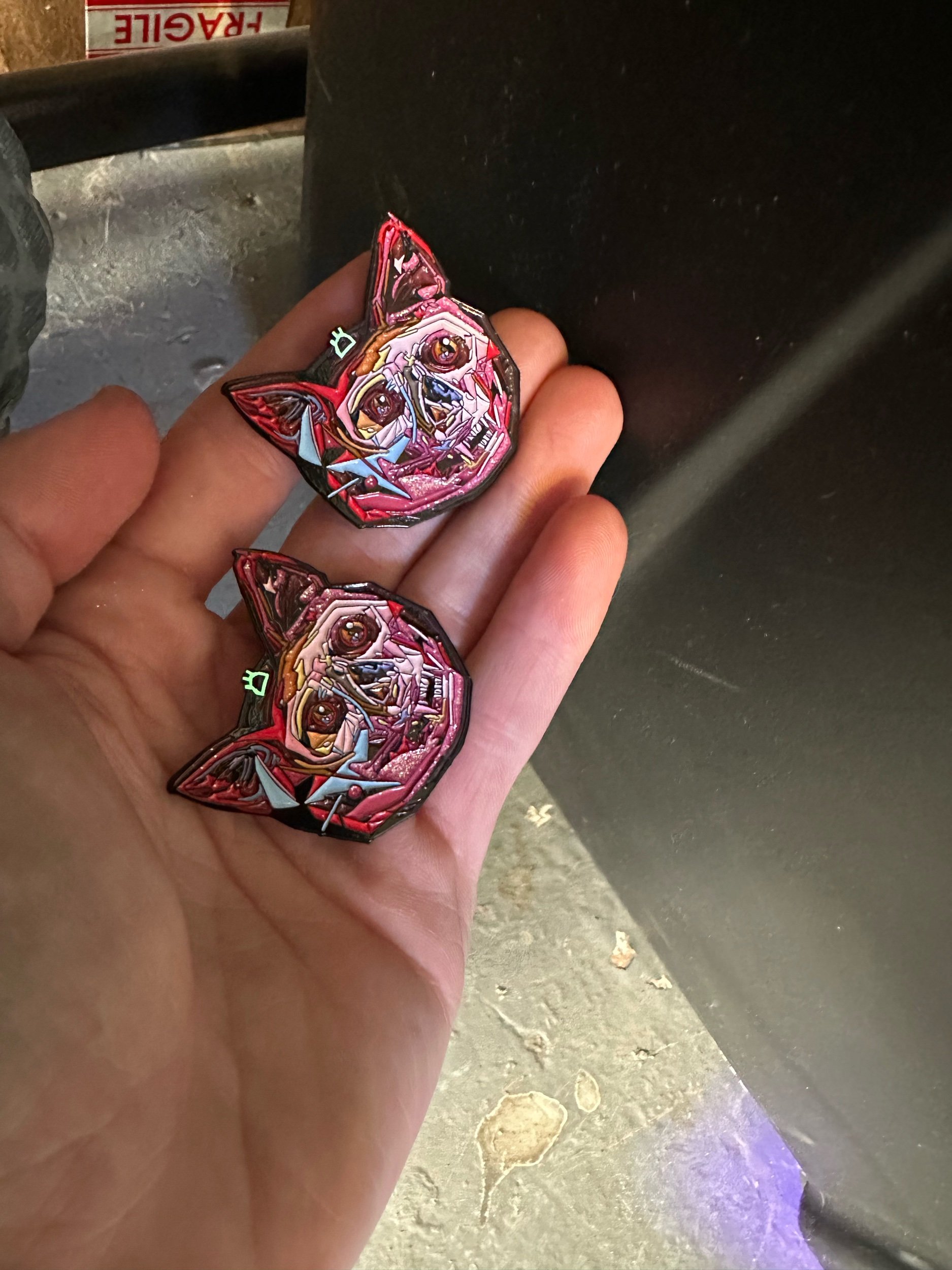 Store › Skull cat soft enamel pin Image 1 of 5 Image 2 of 5 Image 3 of 5 Image 4 of 5 Image 5 of 5 Skull cat soft enamel pin $12.00 1.5 inch soft enamel pin, 2 anchor points, glows in the dark, uv reactive paint, glitter. Quantity: Add To Cart Added! 1.5 inch soft enamel pin, 2 anchor points, glows in the dark, uv reactive paint, glitter.